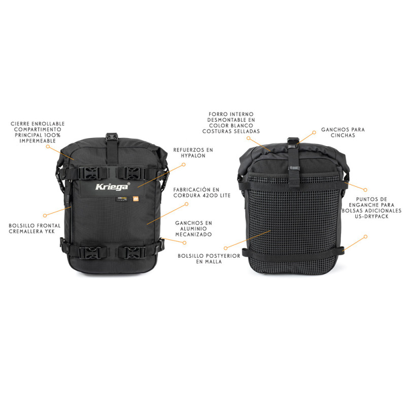 KRIEGA, especialista en soluciones de equipaje para la moto y el motorista nos presenta su nueva gama de bolsas universales DRYPACK CORDURA, especialmente pensadas para ser instaladas en CUALQUIER MOTO deportiva o en motos que carecen de posibilidad de instalación de maletas sin necesidad de realizar NINGÚN tipo de modificación en nuestra moto. Las bolsas de equipaje de moto US DryPack Cordura han sido fabricadas en cordura y en materiales de altísima calidad, además de ser totalmente impermeables gracias a su forro interior. Este forro es totalmente desmontable, lavable y reemplazable en caso de ser necesario. Su color blanco no es casual, ya que de esta forma será mucho más fácil encontrar pequeños objetos en su interior. La gran ventaja de las DRYPACK es su versatilidad, permitiendo al motorista incrementar el volumen de su equipaje según sus necesidades. Todas las bolsas pueden conectarse entre sí como si se tratara de un puzzle obteniendo hasta 70L de capacidad. Los tamaños disponibles son de 5, 10, 20 y 30L.