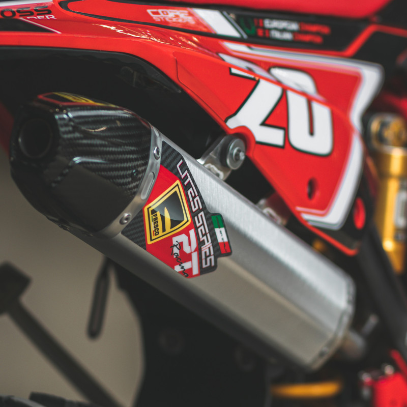 El revestimiento exterior en níquel + cromo que garantiza una gran resistencia a la intemperie. El desarrollo está optimizado para reducir el volumen y mantener la bufanda muy cerca del motor. Para la versión enduro la bufanda suaviza la salida del motor sin penalizar la potencia máxima. Compatible con el silenciador original.