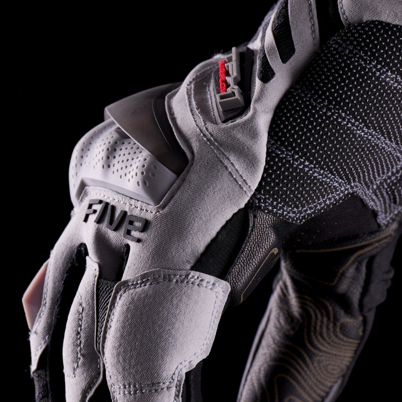 Los elementos que componen los dedos del guante están unidos con costuras externas para mejorar la sensación de comodidad y precisión a los mandos. Y un nuevo elemento de confort hace su debut en este estilo: las almohadillas antivibración VibraLess (una innovación de FIVE) en el pulgar y la palma, que tienen como objetivo absorber las vibraciones que se sienten a alta velocidad en pistas todoterreno o con superficies irregulares (asfalto dañado, grava, superficies rocosas, etc.).