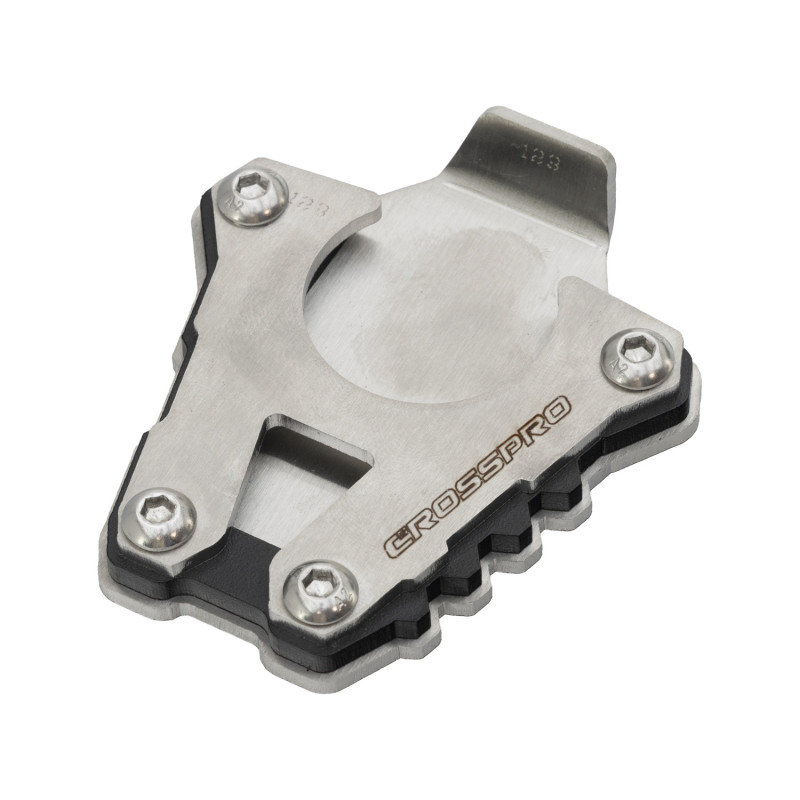 La base de ampliación para el caballete lateral de Crosspro aumenta la zona de apoyo y aporta más estabilidad en terrenos difíciles como arena, tierra o grava.